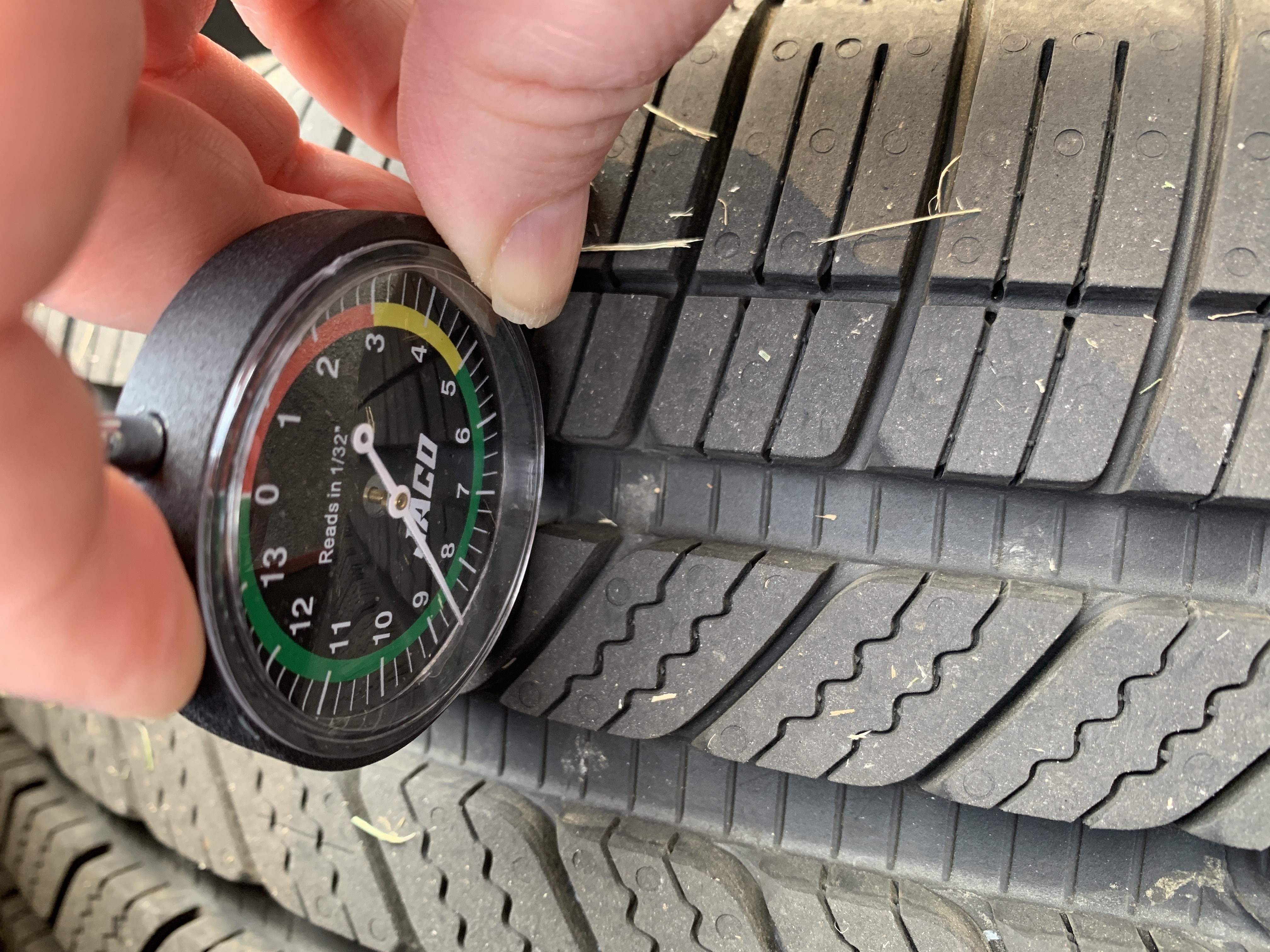 Note that most tires have “wear bars” in the main groove(s) of the tires. These are at 2/32" so if your tire tread wears down to the depth of the wear bars, you should replace them immediately. The photo above clearly shows the wear bars in the main groove of the tires being measured.