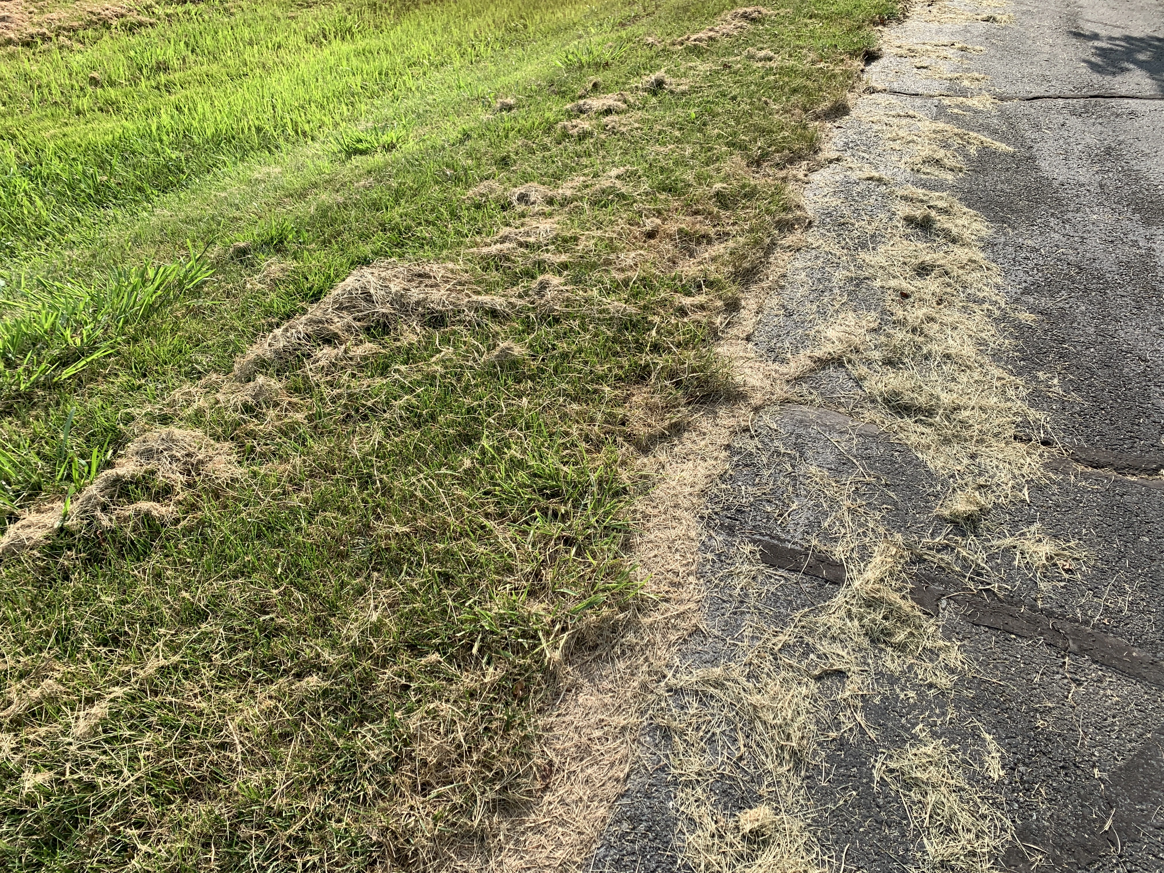Note that another reason to avoid cutting the grass too low is that this can cause the cut grass to clump, and the clumps tend to kill the grass. See the photo below for an example of grass that wasn’t cut often enough, resulting in clumps which will yellow and then kill the grass under the clumps. If you do end up with clumps when you cut, the best way to disperse this is with a leaf blower.