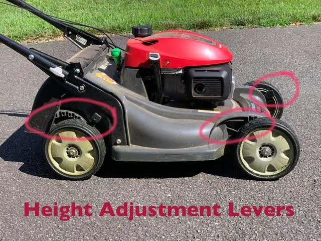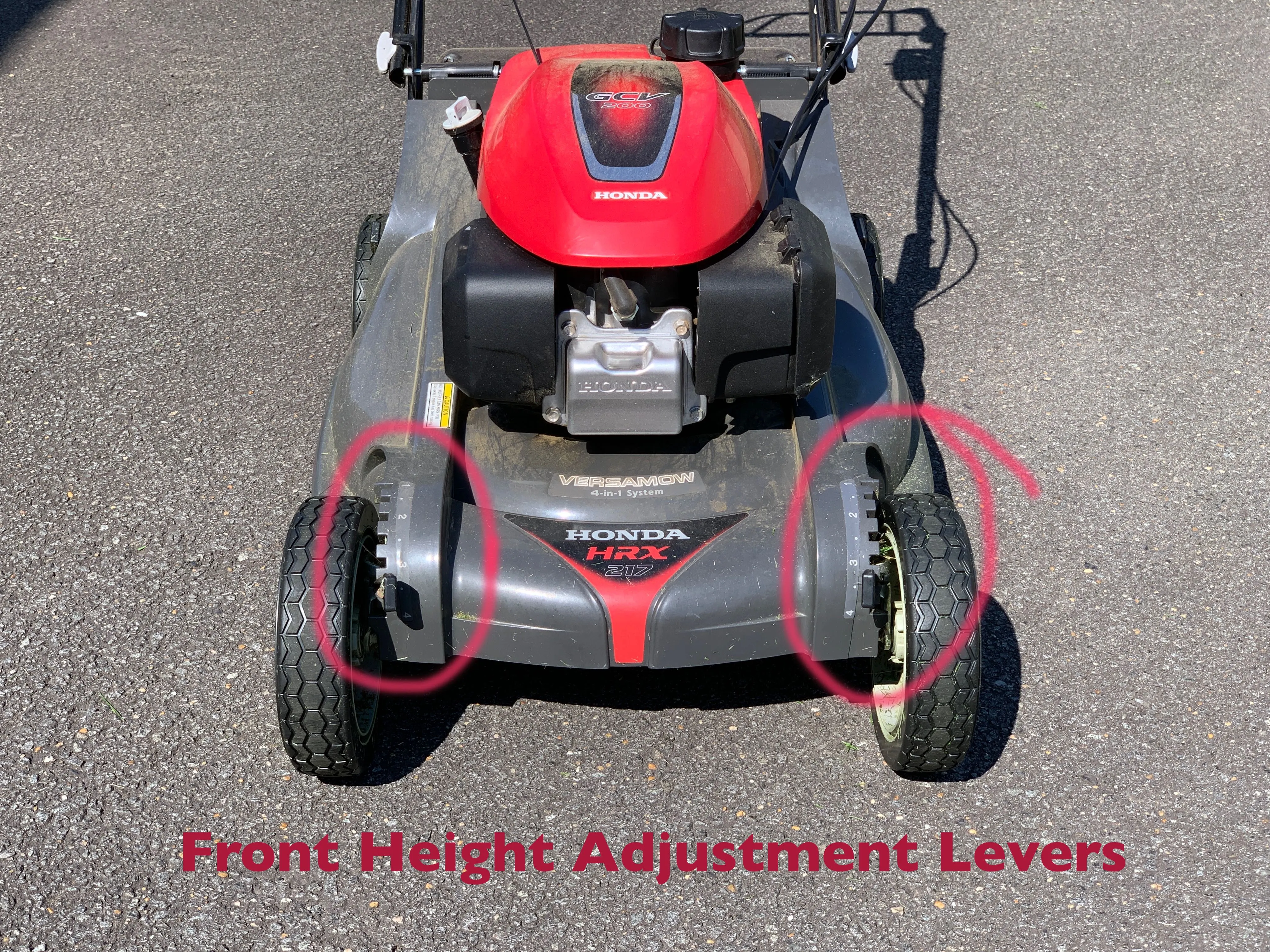 Height adjustment knobs are typically labeled, but usually with a code rather than an actual cutting height. I suspect manufacturers do this so they can sell mowers both in the US (which uses English units) and the rest of the world (which uses metric). My Honda HRX217 has seven height positions. These are labeled 1, 2, 3, and 4. The adjustment knob can be set to one of these numbers, or between the numbers. To raise my cutting height from 3" to 3.5" inches, I moved each adjustment knob from “3” to between “3” and “4”.