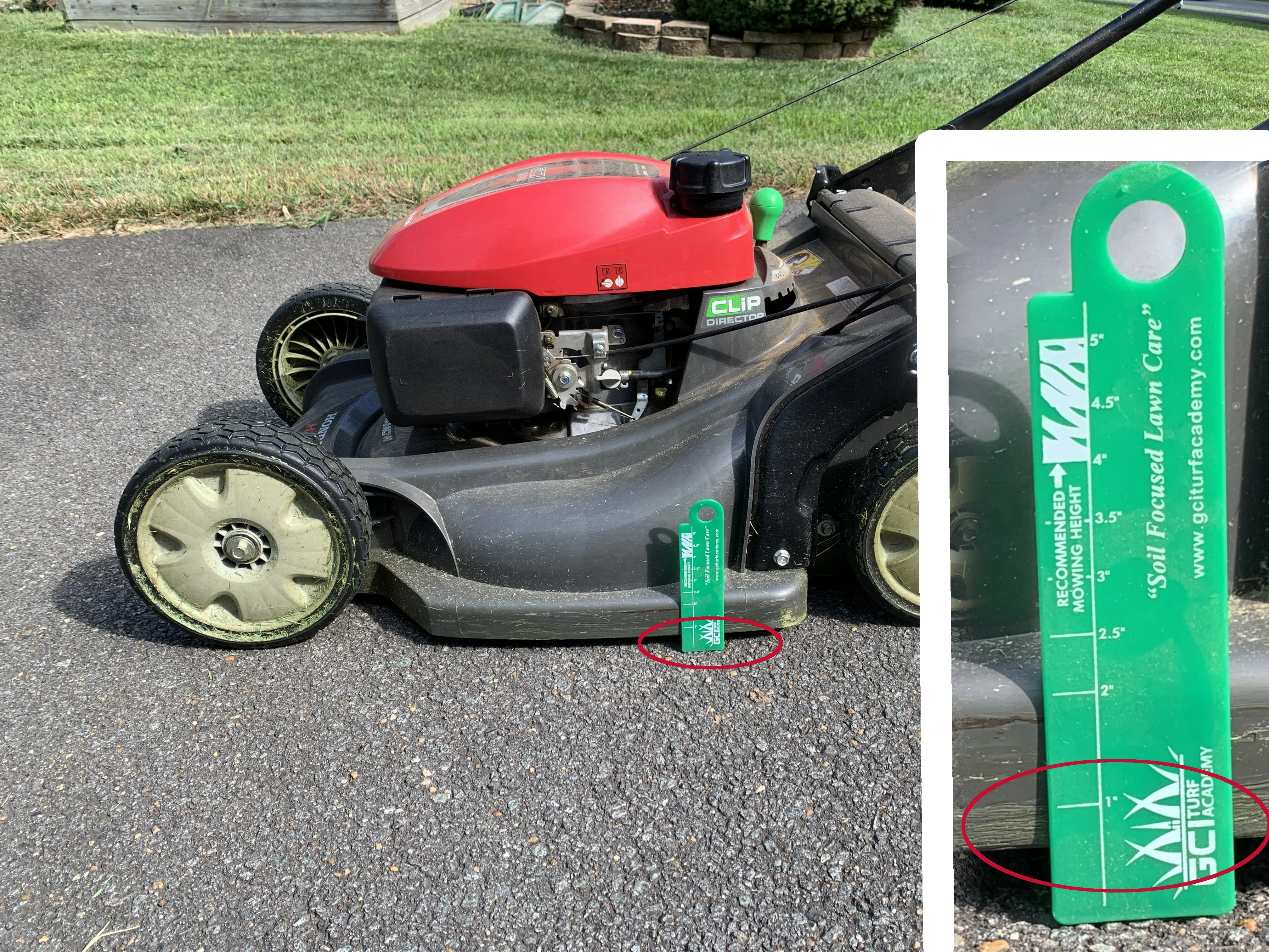 The photos below show a lawn mower adjusted to 3.5" cutting height, and to 1" cutting height. Note that went cutting the grass low, you are more likely to hit obstacles such as sprinkler heads, rocks, etc. I’ve managed to accidentally scalp the tops off some of my sprinkler heads when cutting low.